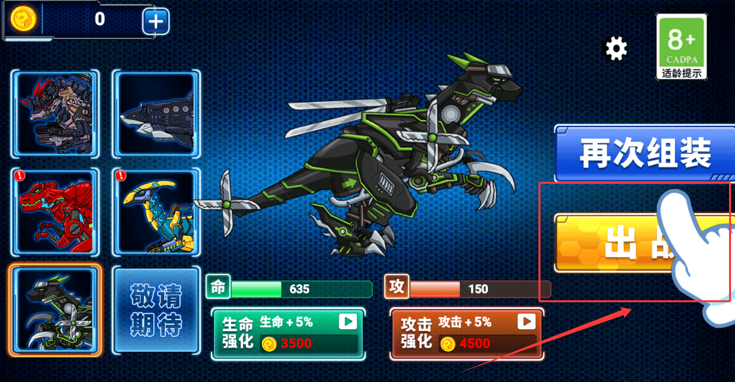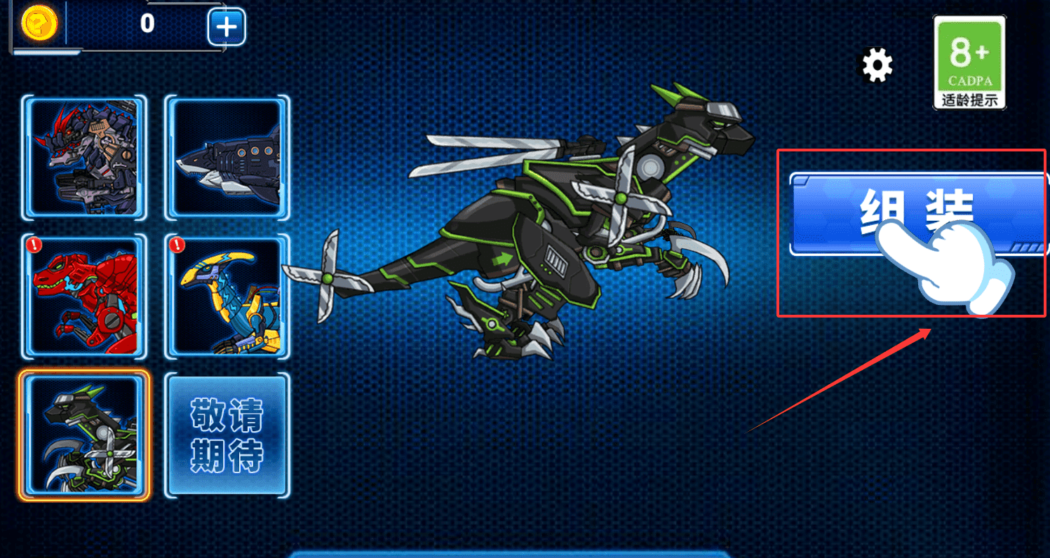 1、进入游戏后首先需要移动各个机甲零件将恐龙拼接成形,完成组装后点击出战按钮即可进入竞技场。