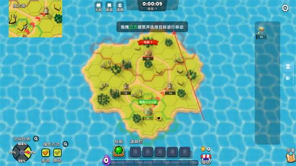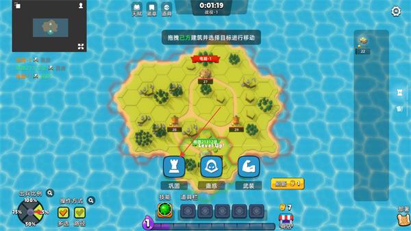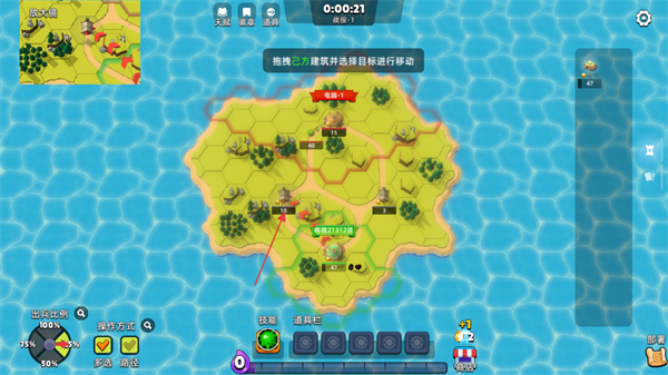 1、在岛屿地图上,拖拽史莱姆并选择目标进行移动,抢占领地和资源点。