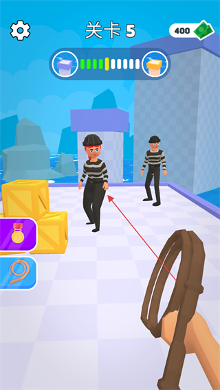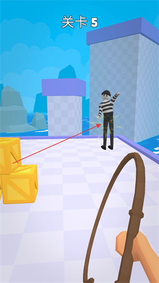 1、在关卡5中,瞄准条纹服装的目标人物,发射皮鞭缠住他们。