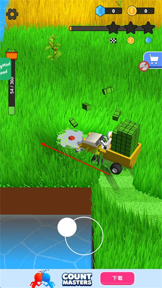 2、车辆进入草地区域,使用前端锯片切割绿色方块,方块碎片散落,左侧进度条显示54/360,保持车辆按箭头方向行进。