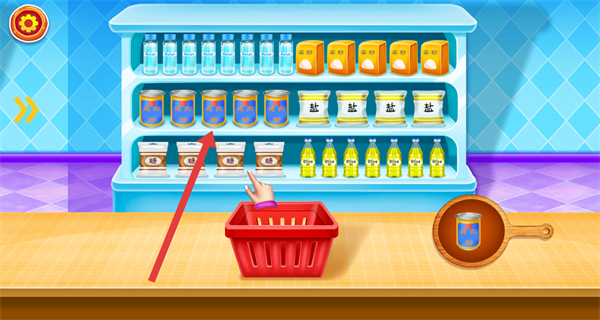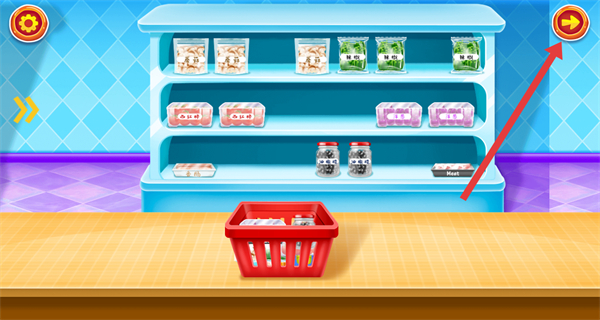 3、在超市内,根据提示点击货架上的材料,将其放入红色购物篮中。