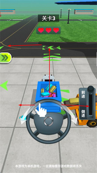 3、操作方向盘控制车辆方向,操作前进倒退杆控制车辆移动,沿着绿色箭头指示路径行驶。