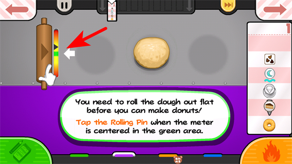 3、制作甜甜圈时,观察擀面杖的计量条,当计量条处于绿色区域时点击擀面杖,将面团擀平,这是制作甜甜圈的基础步骤,确保厚度合适。