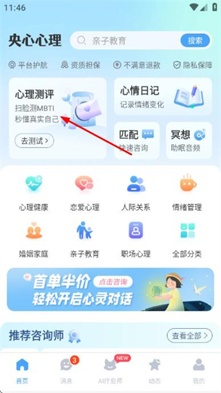 1、在央心心理首页点击心理测评板块,进入心理测评页面。