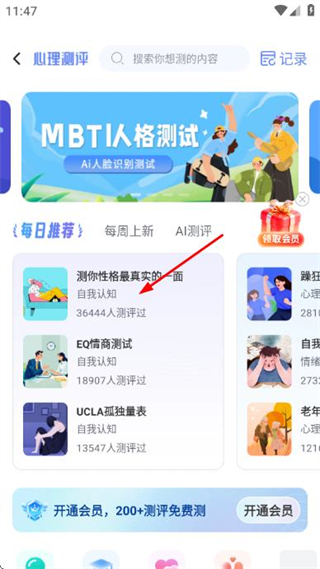 2、在心理测评页面点击目标测评项目,进入题目页面。