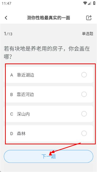 3、在测评题目页面选择对应选项后,点击下一题继续完成心理测评。