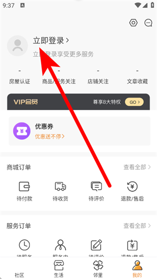 2、在我的页面,点击立即登录区域,进入登录页面。