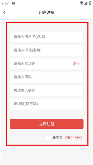 4、在用户注册页面,依次填写信息并勾选协议后,点击立即注册即可完成注册。