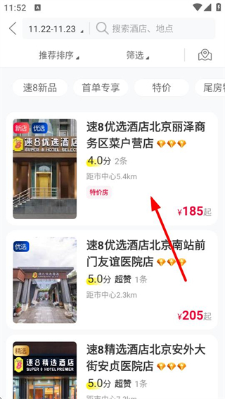 1、在速8酒店首页,选择信息后,点击搜索酒店,进入酒店列表页面。