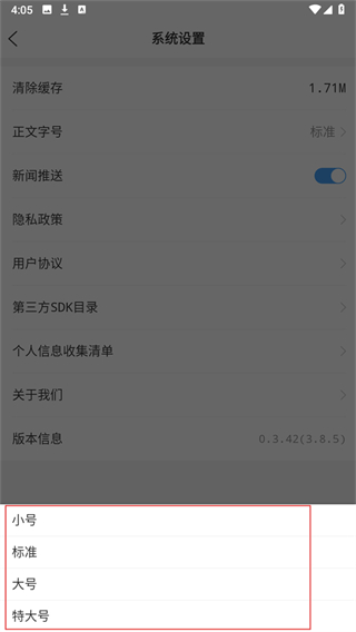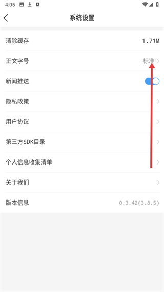 3、找到正文字号选项,点击箭头进入字号选择页面。