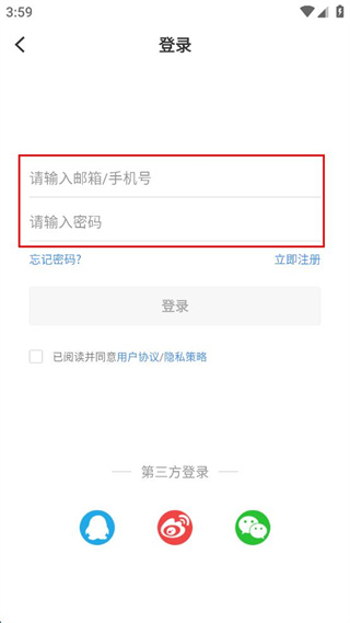 3、进入登录页面,依次输入邮箱/手机号、密码。