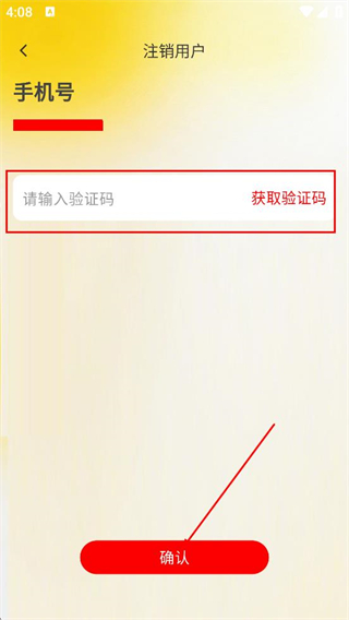 5、在注销验证页面,输入手机号获取的验证码后点击确认,完成账号注销操作。