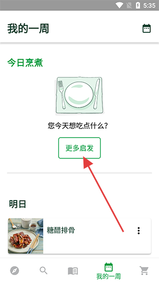 2、在我的一周页面,若今日无菜谱可点击更多启发获取菜谱灵感。