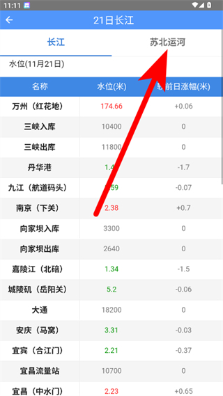 2、在水位查看页面,点击苏北运河选项,切换至苏北运河水位列表。