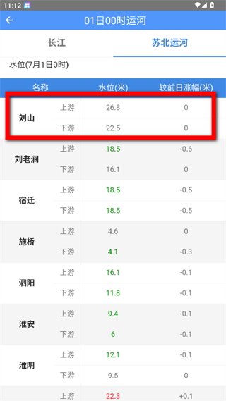 3、在苏北运河水位列表中,可查看刘山、刘老涧等多个地点的上游、下游水位及较前日涨幅信息。