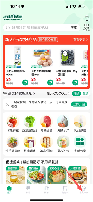 1、在元初食品APP首页,点击底部个人中心,进入页面。