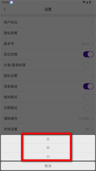 4、在字体大小选择界面,可选择大、中、小字号,选择后即可完成字体大小设置。