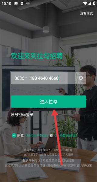 1、打开拉勾招聘APP,在弹出的用户协议及隐私政策提示框中,点击同意按钮。