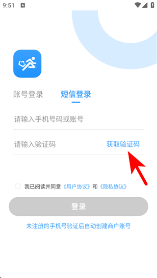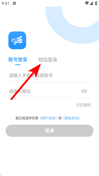 1、打开快跑者,点击短信登录,切换至短信登录界面。