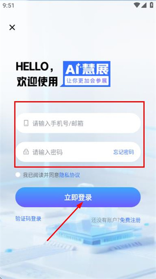 3、在登录界面填写手机号和密码,勾选隐私协议后,点击立即登录完成账号登录操作。