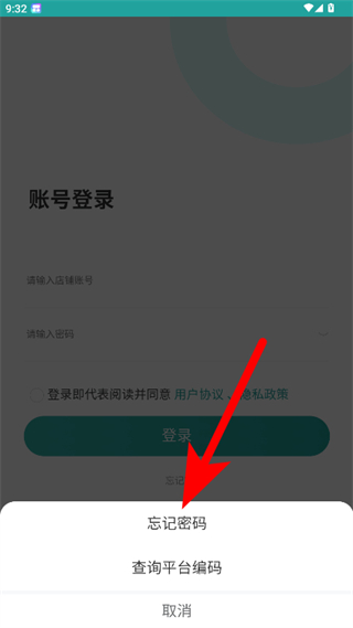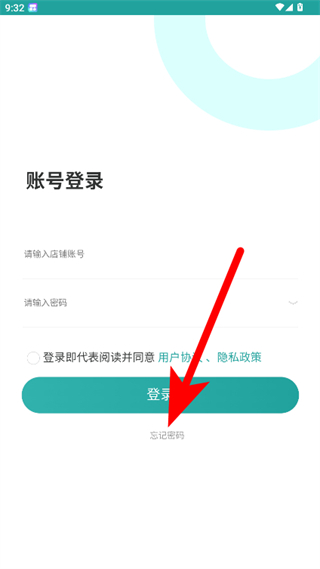 1、在快跑者app账号登录页面,点击忘记密码选项,弹出功能菜单。