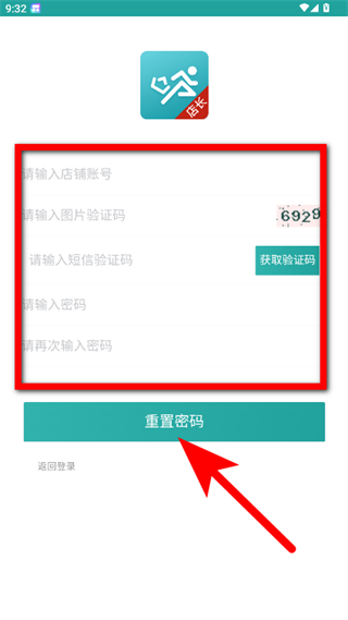 3、在密码重置页面,依次输入店铺账号、图片验证码、短信验证码、新密码及确认新密码。