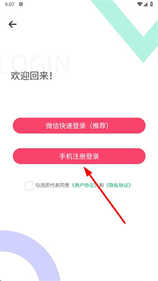 3、在登录选择界面,点击手机注册登录,进入注册登录界面。