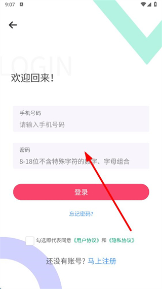 4、在界面点击还没有账号马上注册,按照提示输入手机号码、设置密码,勾选同意用户协议后完成注册。
