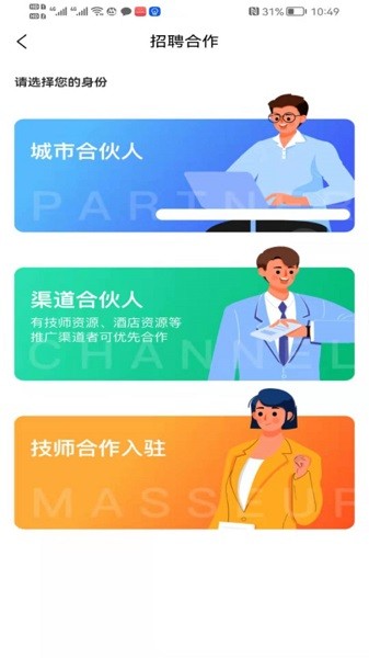 --招聘合作,提供城市合伙人、渠道合伙人、技师合作入驻等身份