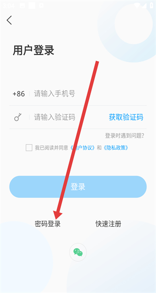 3、跳转到用户登录页面中,可以点击下方密码登录按钮,切换使用密码登录。