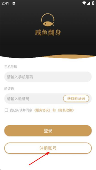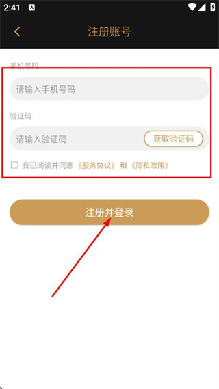 3、在注册账号页面填写手机号码、获取并输入验证码,勾选服务后,点击注册并登录完成账号注册操作。