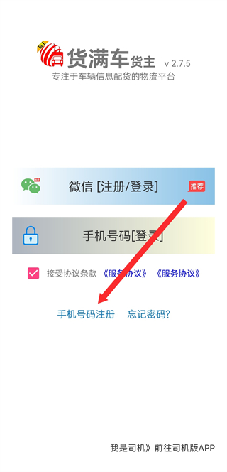 1、打开货满车,点击手机号码注册,进入注册方式选择界面。