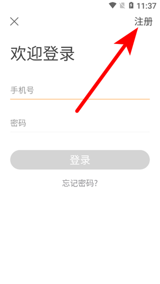 3、在登录注册界面,点击右上角注册选项,进入手机号注册页面。