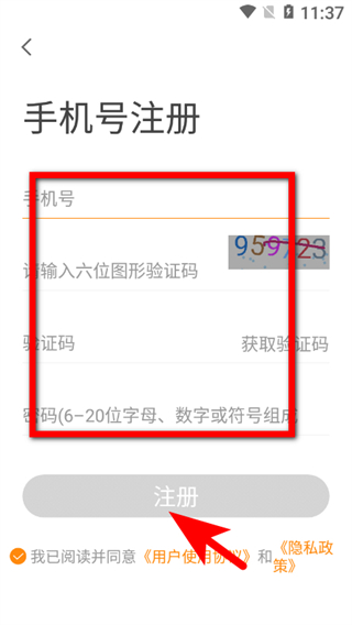 4、依次输入信息,勾选同意协议后点击注册按钮,即可完成注册流程。