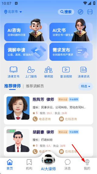 1、在法律服务首页点击底部我的,进入登录相关操作页面。