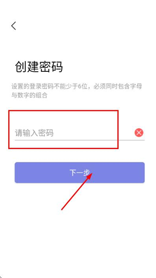 4、在创建密码页面填写符合要求密码,点击下一步完成账号注册登录操作。
