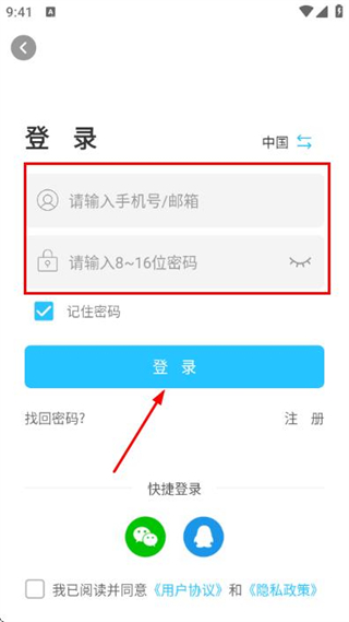 3、在登录页面填写手机号、密码,勾选协议后,点击登录完成账号登录操作。