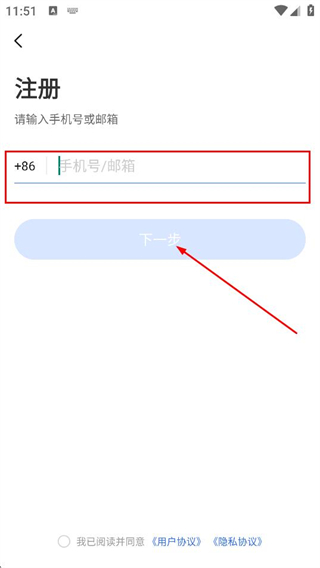 3、在注册界面,输入手机号/邮箱,勾选已阅读并同意后,点击下一步。