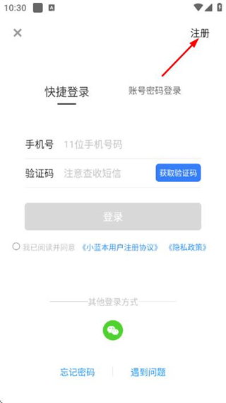 1、进入软件点击右上角的注册,进入账号注册页面。