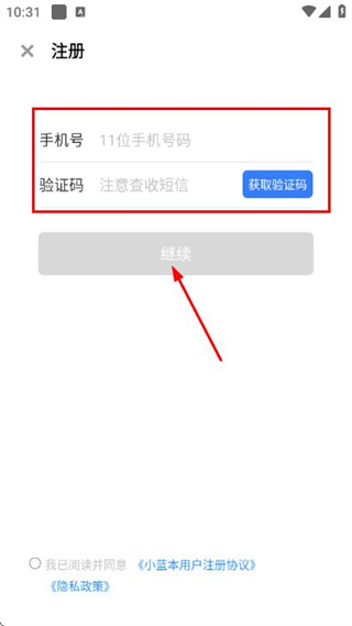 2、在注册页面填写手机号码,点击获取并填写验证码,勾选相关协议后点击继续。