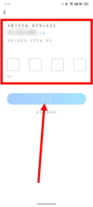 4、在短信验证页面,填写收到的验证码,点击下一步。