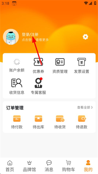 2、在个人中心页面,点击登录注册选项,进入登录页面。