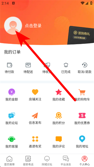 2、在个人中心页面,点击登录区域,进入登录页面。