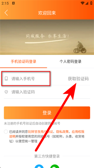 3、在手机验证码登录页面,输入手机号后,点击获取验证码。