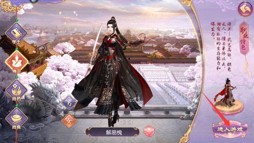 2、选择心仪的职业方向并输入角色专属名称,完成创建后正式踏入深宫庭院世界。