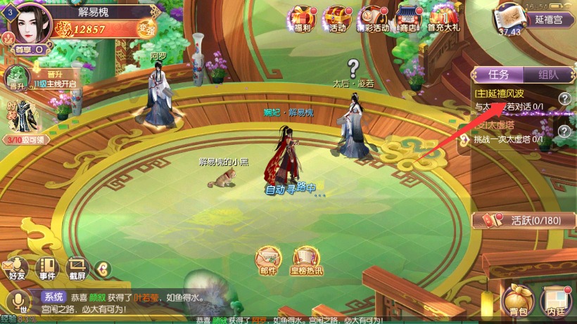 3、点击右上角任务栏开启自动追踪功能选项,系统将引导你完成各类宫廷事务任务。