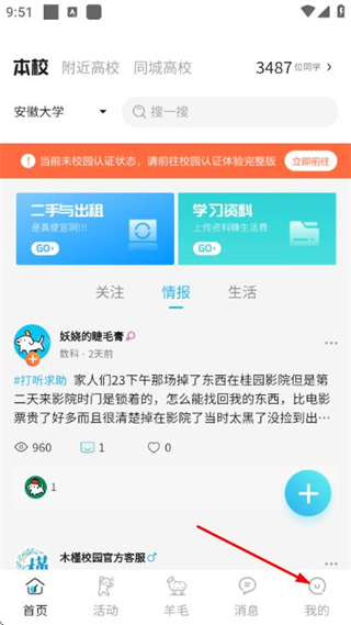 1、在木槿校园首页点击底部我的,进入我的页面。