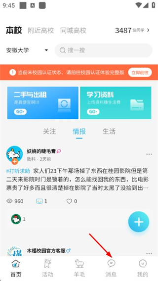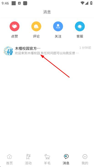1、在木槿校园首页点击底部的消息,进入消息页面。