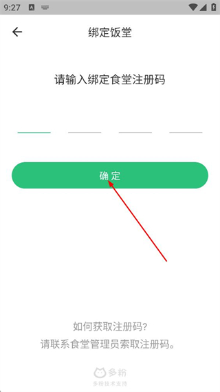 3、登录后进入绑定饭堂页面,输入食堂注册码,点击确定,完成饭堂绑定。
