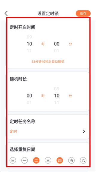 2、在设置定时锁页面,设置定时开启时间,锁机时长等信息。